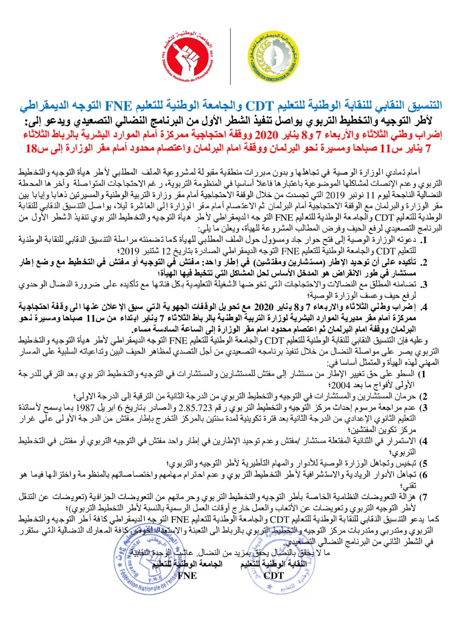 بلاغ للتنسيق النقابي للنقابة الوطنية للتعليم CDT والجامعة الوطنية للتعليم FNE التوجه الديمقراطي لأطر التوجيه والتخطيط التربوي