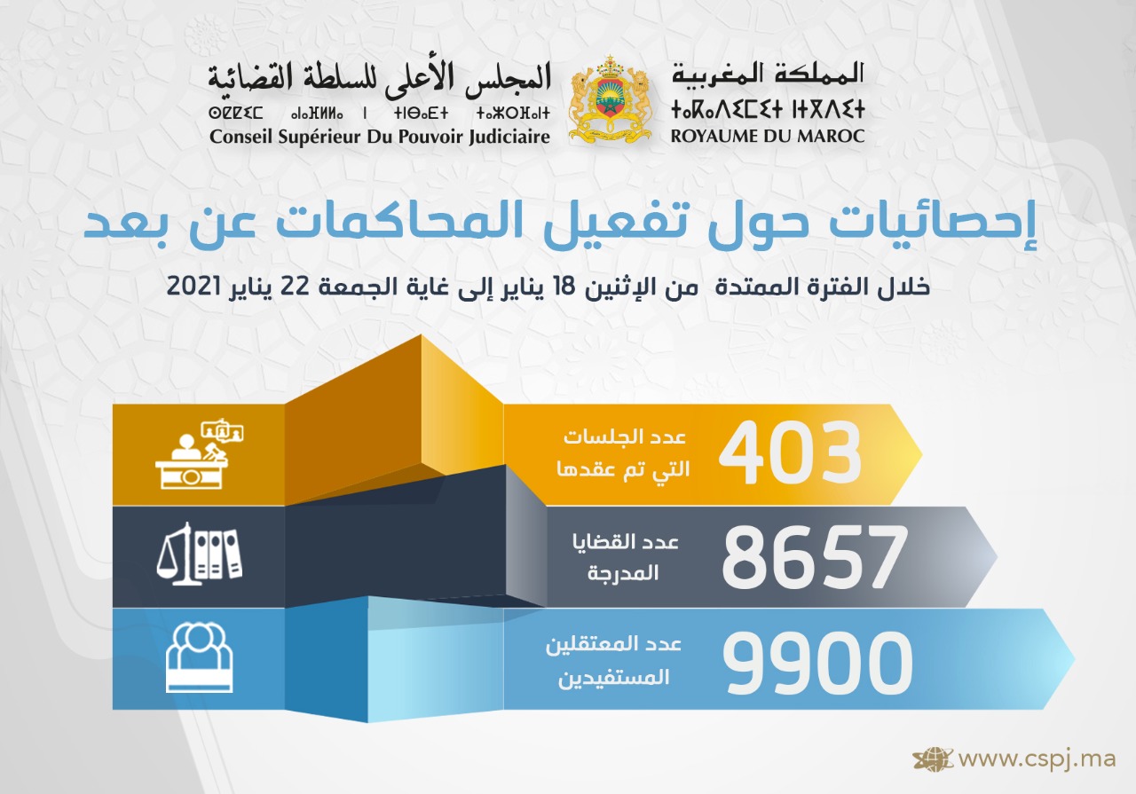 تكريسا لقيم الانفتاح والتواصل بخصوص مختلف التدابير المتخذة من طرف المجلس الأعلى للسلطة القضائية للحد من انتشار “فيروس كورونا” ببلادنا، ينهي المجلس للرأي العام الوطني أن مشروع المحاكمة عن بعد الذي أطلقه بمعية باقي الشركاء في منظومة العدالة، سجل خلال الفترة الممتدة من الاثنين18 يناير إلى الجمعة 22 يناير 2021 حصيلة متميزة بالنظر إلى الأرقام المسجلة، بحيث عقدت مختلف محاكم المملكة خلال هذه الفترة 403 جلسة أدرجت خلالها 8657 قضية، واستفاد منها 9900معتقلا تمت محاكمتهم عن بعد دون الحاجة إلى نقلهم إلى مقرات المحاكم.