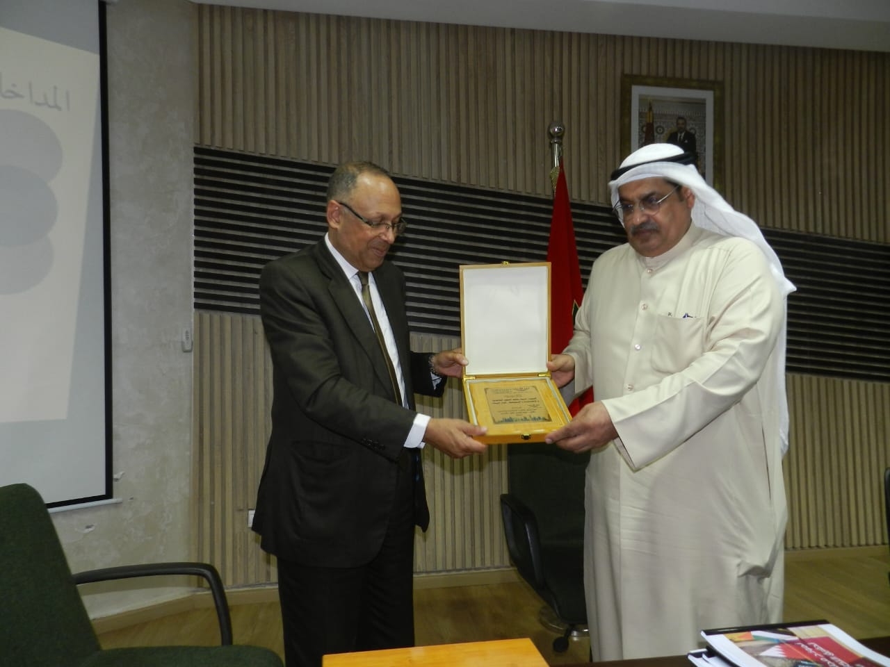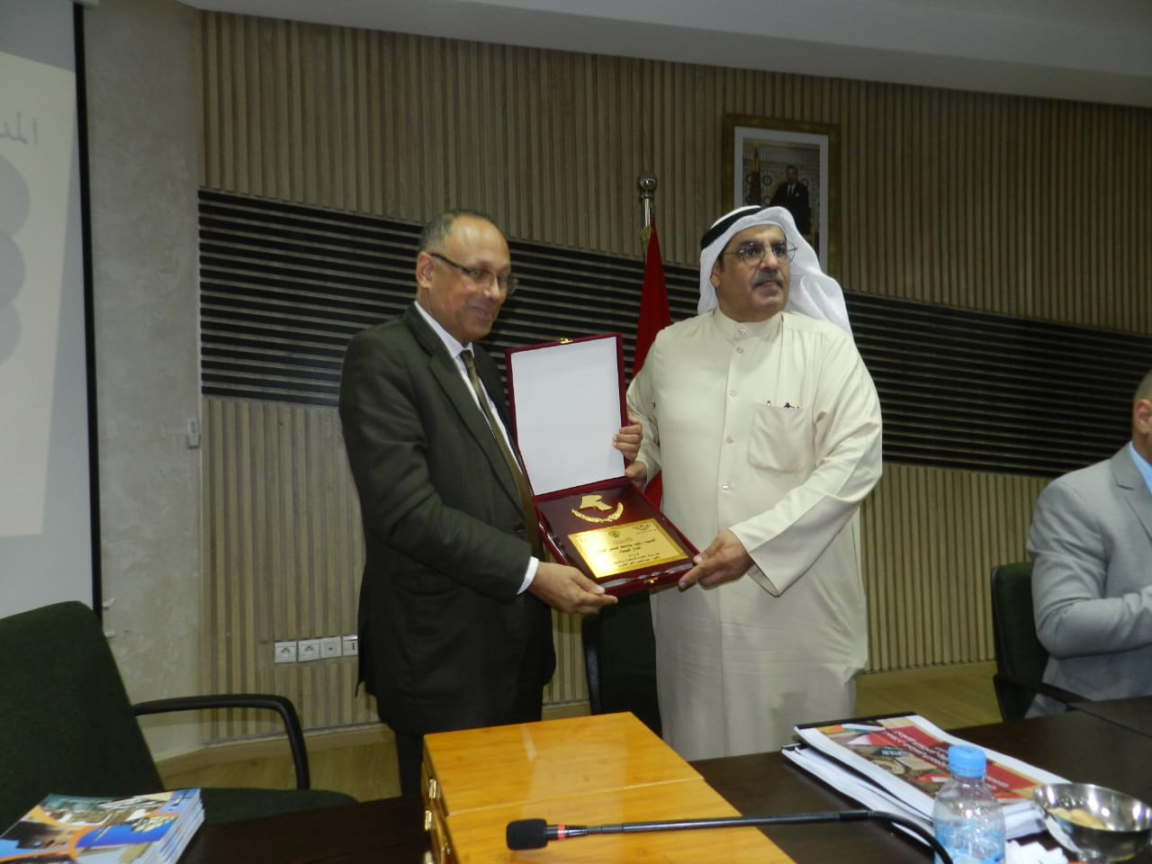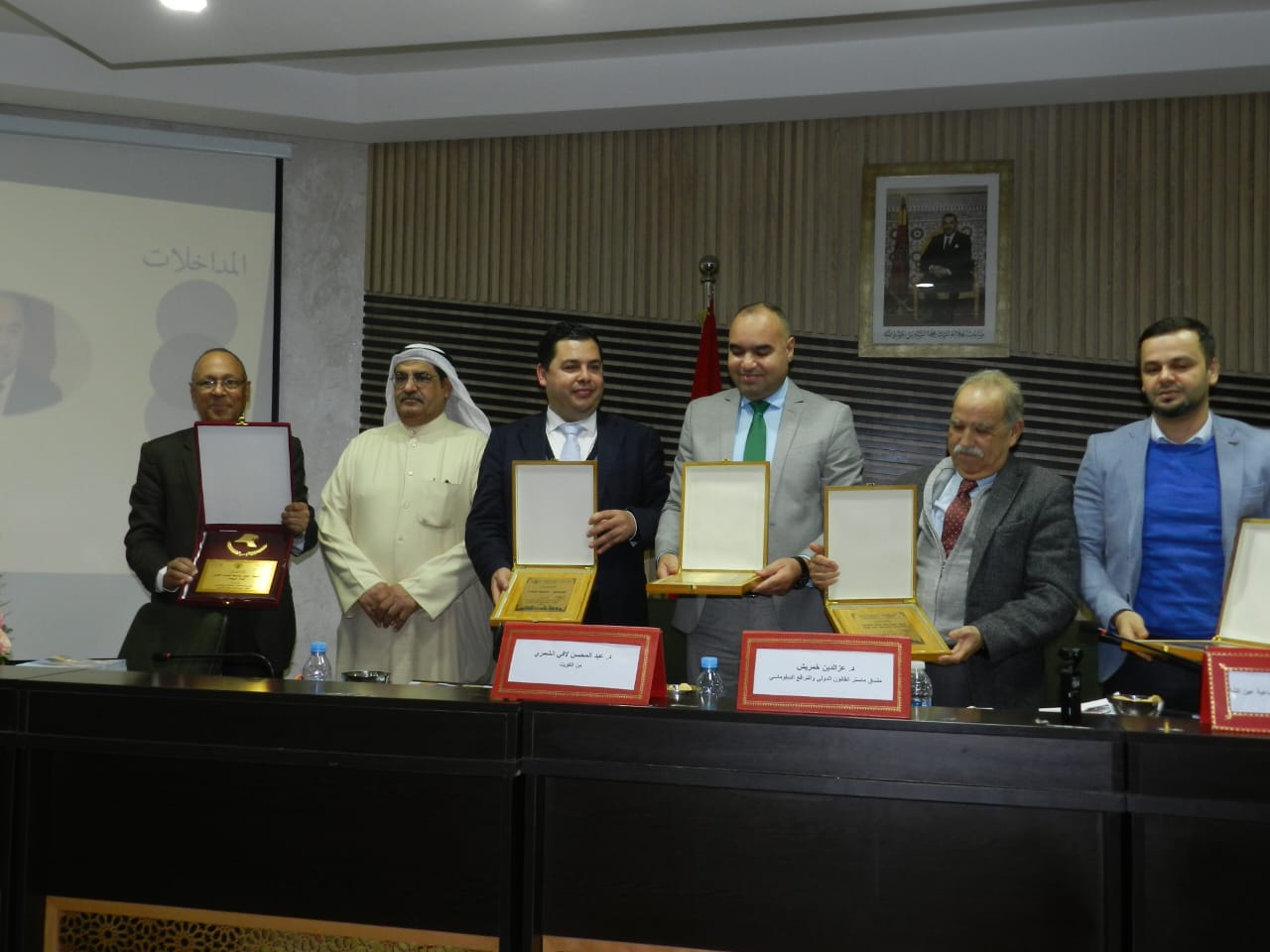 كما جرت العادة في جميع الأنشطة العلمية التي يقوم بها الماستر تقدم عميد الكلية الدكتور عبد اللطيف كمات بتقديم شعار ماستر القانون الدولي والترافع الدبلوماسي للدكتور عبد المحسن لافي الشمري وتقديم له البدلة الدبلوماسية للماستر من طرف الدكتور عز الدين خمريش منسق الماستر.