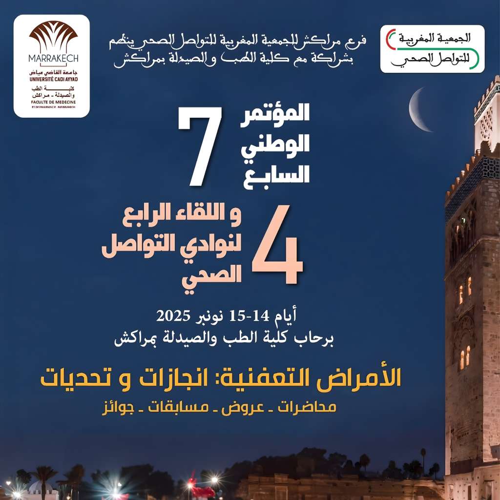Dans le cadre de la dynamique nationale que connaît le système de santé marocain, et en phase avec les Hautes Orientations de Sa Majesté le Roi Mohammed VI, que Dieu L’assiste, appelant à la refonte du secteur de la santé, à la généralisation de la protection sociale et à l’amélioration de la qualité des services, l’Association Marocaine de Communication en Santé (AMCS) et sa section régionale organisent, en partenariat avec la Faculté de Médecine et de Pharmacie de Marrakech, le 7ᵉ Congrès National de la Communication en Santé ainsi que la 4ᵉ Rencontre des Clubs de Communication en Santé, les 14 et 15 novembre 2025, à la Faculté de Médecine et de Pharmacie de Marrakech, sous le thème :